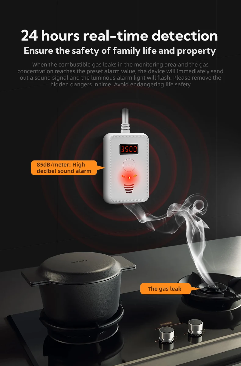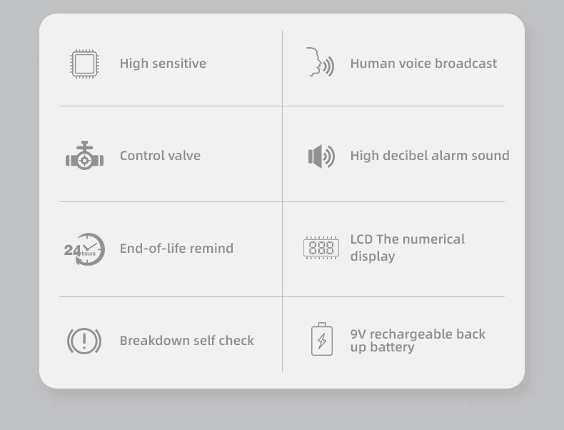 1.High reliability sensor 2.A human voice alarm 3.Flammable gas detectors 4.Automatically detect sensor faults 5.SMT design, high stability